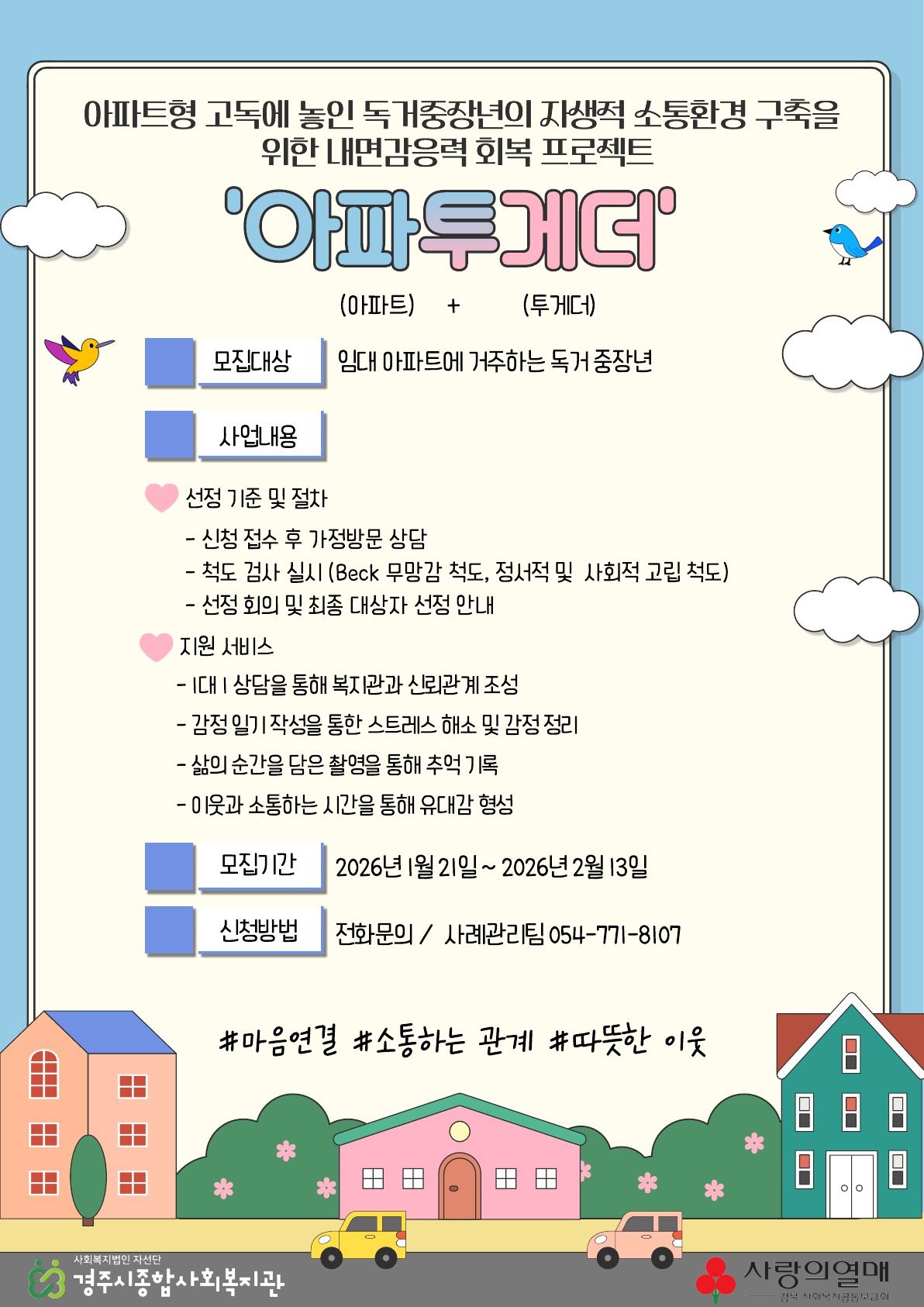 2026년 아파트형 고독에 놓인 독거 중장년의 자생적 소통환경 구축을 위한 내면 감응력 회복 프로젝트 '아파투게더' 홍보