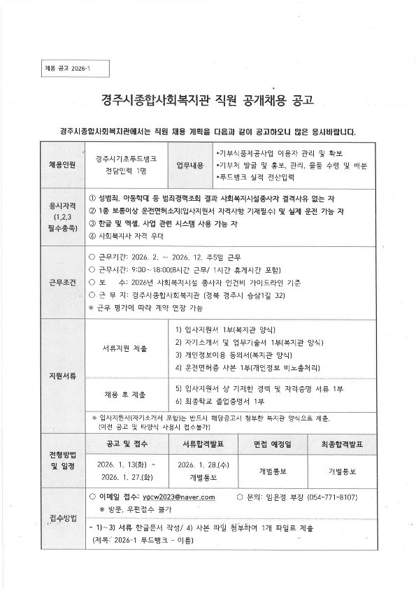 [채용공고 2026-1]2026년 1월 경주시종합사회복지관 직원 공개채용 공고(경주시기초푸드뱅크)