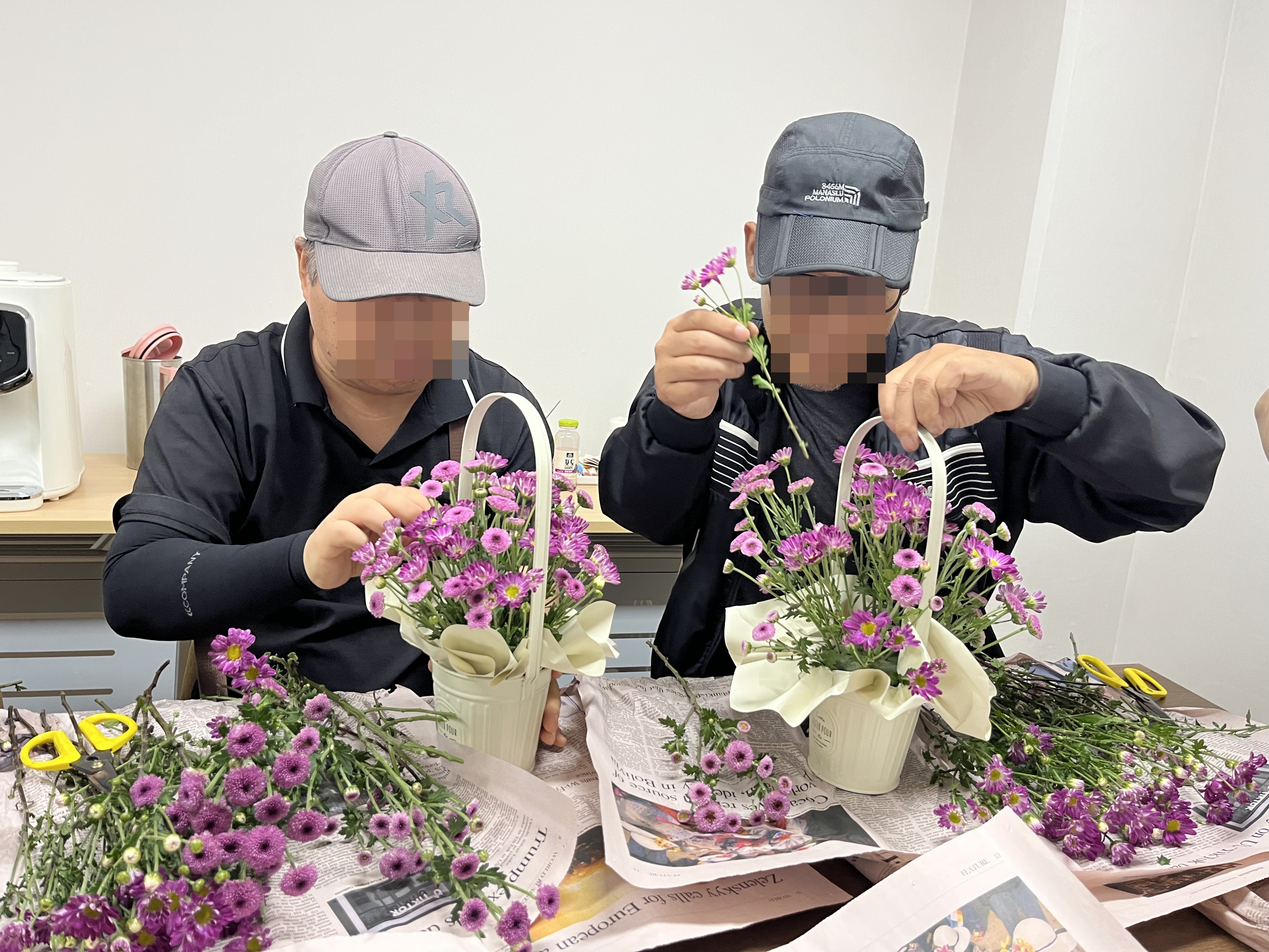 마음연구소 세부 프로그램인 심심(心心)연구실에서는 화사한 9월을 보냈습니다. 누름 꽃을 이용하여 추억의 액자를 만들기도 하고 가을을 대표하는 꽃인 국화를 이용하여 꽃바구니를 만들어보았습니다. 활동 중 참여자께서 “예쁜 꽃을 바라보는 것만으로도 감정의 예민함이 줄어들고 정서적으로 안정을 주는 것 같다”라고 하신 말씀이 기억에 남습니다. 여러 모습의 꽃들이 조화를 이루고 군락을 지어 살 듯 우리 지역사회에도 모든 구성원이 더불어 살아가길 바라봅니다.