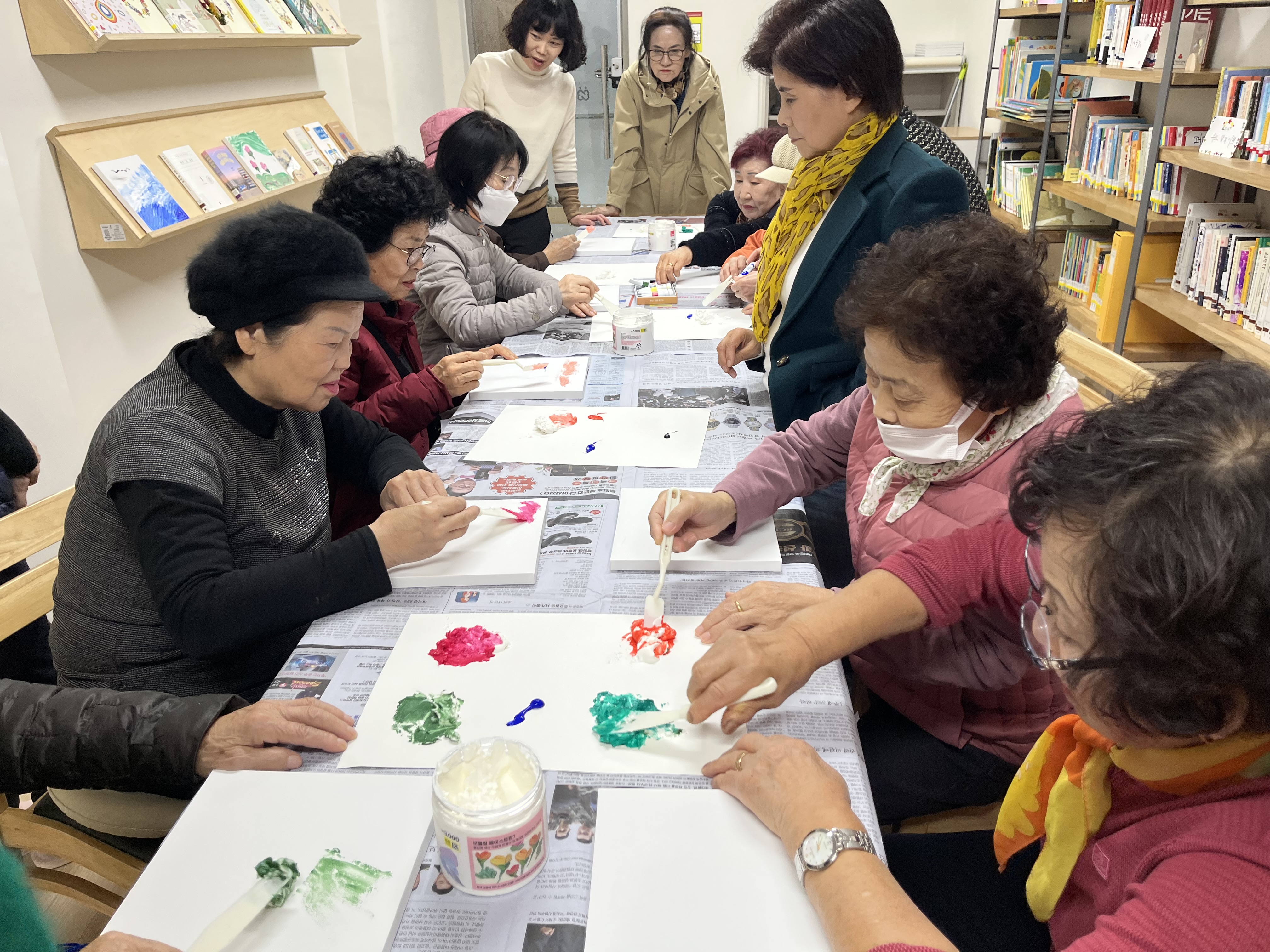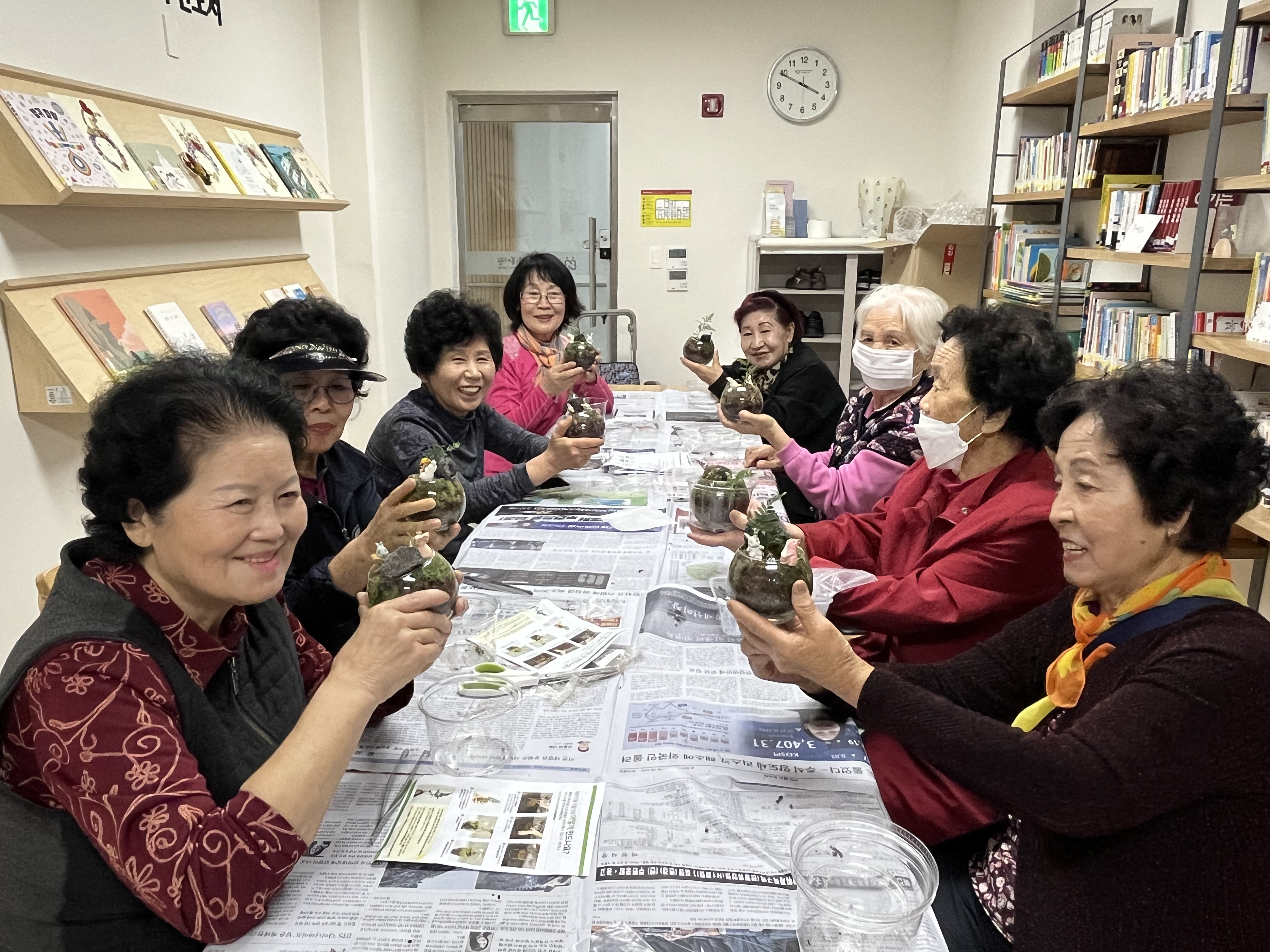 책 내용에 맞춰 <당근할머니> 책은 테라리움 만들기, <나는 기다립니다> 책은 명주실을 이용한 액막이 행운 명태를 만들었습니다. 마지막 꽃갈피 회기에서는 김밥을 주제로 다양한 색이 어우러지는 백드롭 페인팅을 진행했습니다.