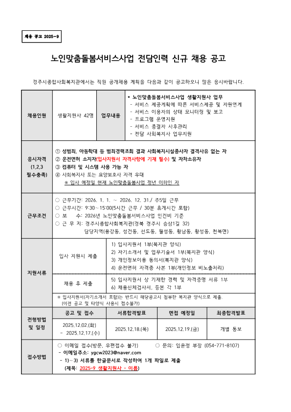 [채용공고 2025-9]2025년 12월 경주시종합사회복지관 전담인력 신규 채용 공고(노인맞춤돌봄서비스사업 생활지원사)