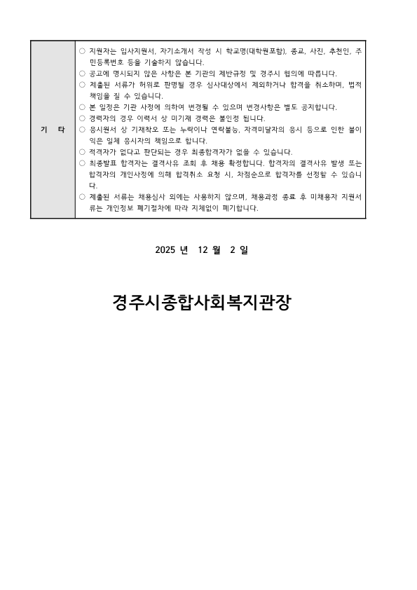 [채용공고 2025-10]2025년 12월 경주시종합사회복지관 직원 공개채용 공고(경주시기초푸...