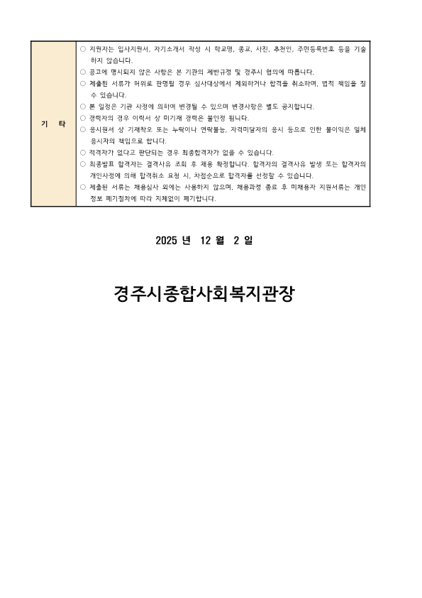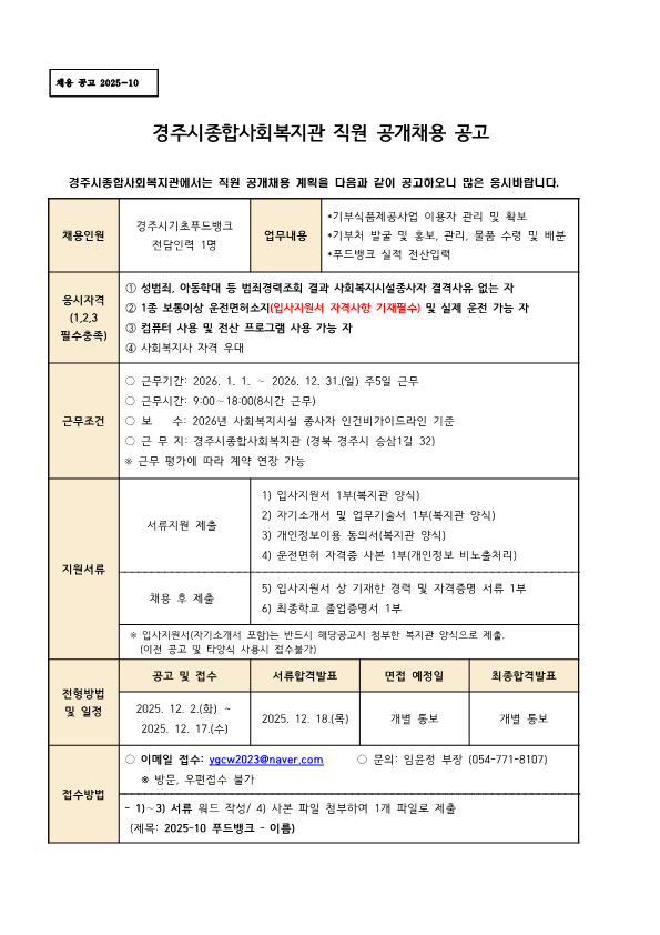 [채용공고 2025-10]2025년 12월 경주시종합사회복지관 직원 공개채용 공고(경주시기초푸드뱅크)