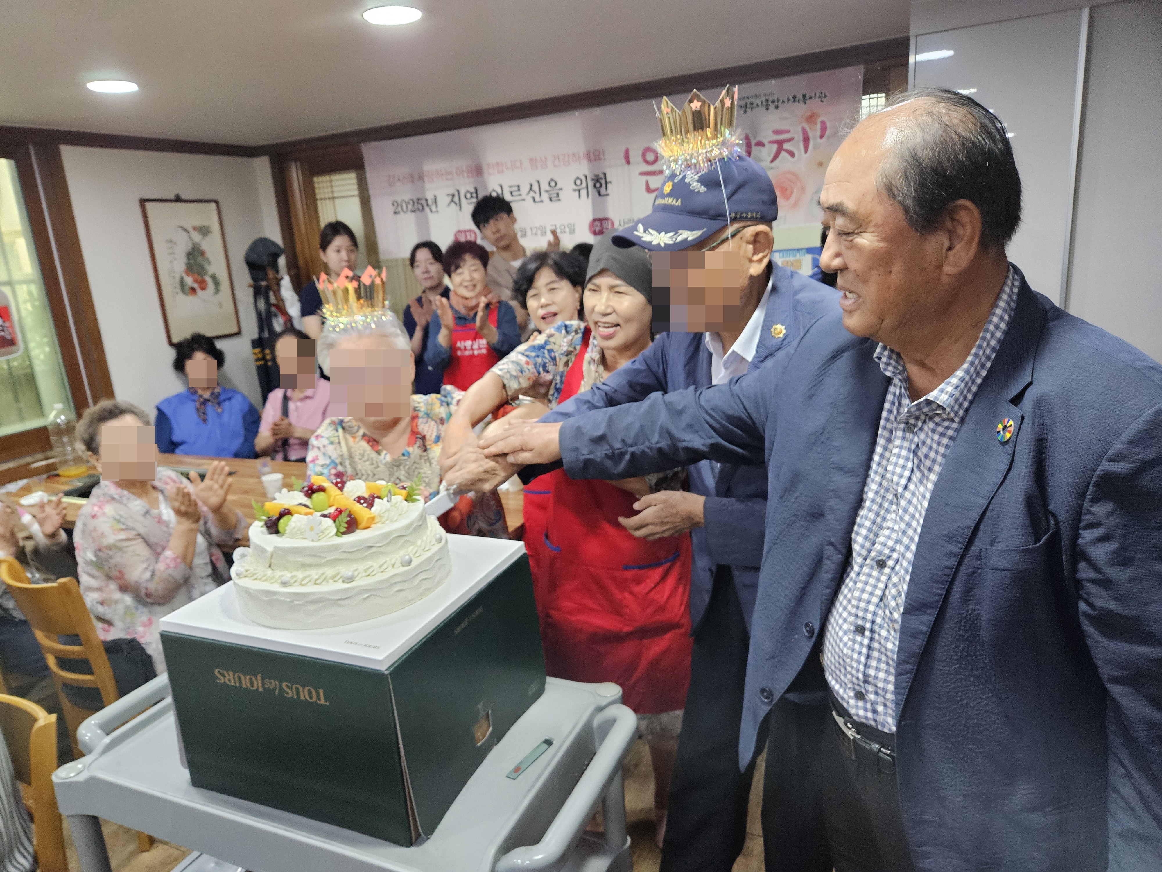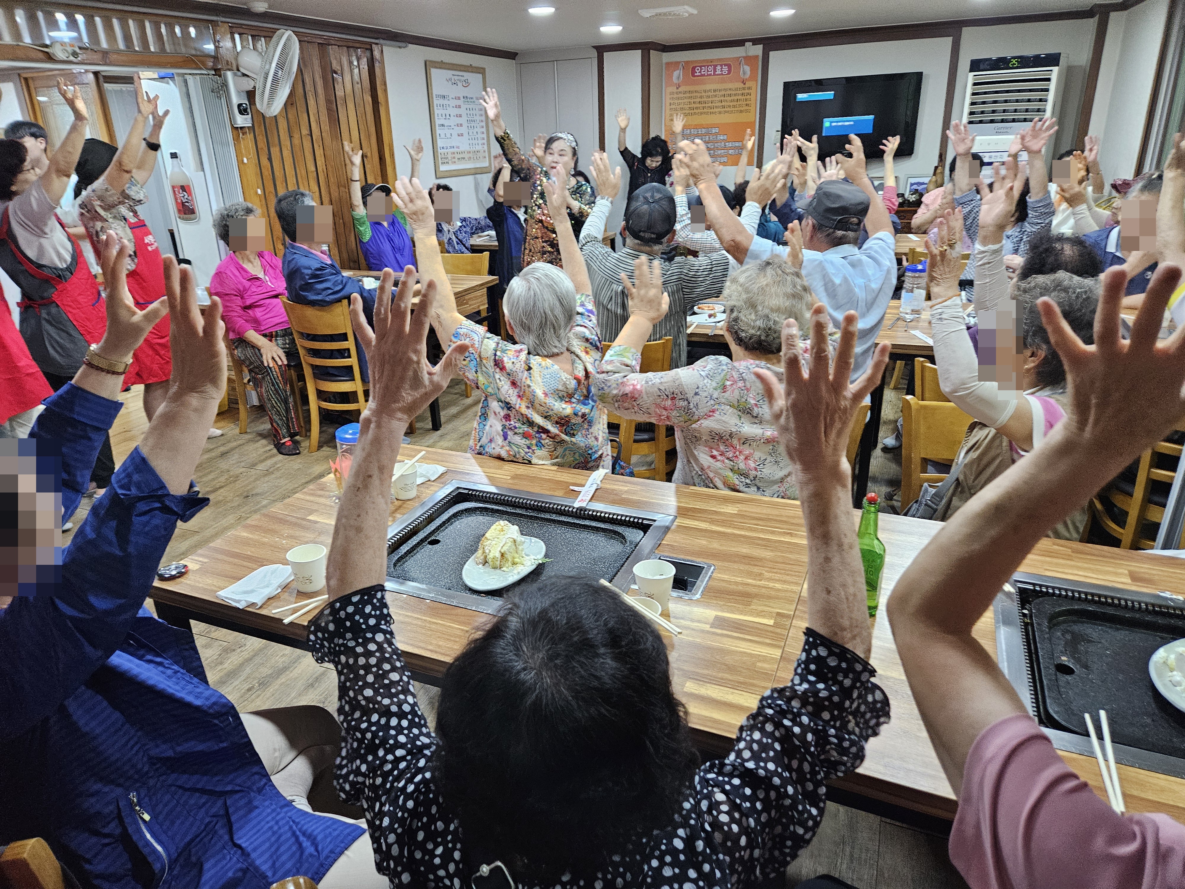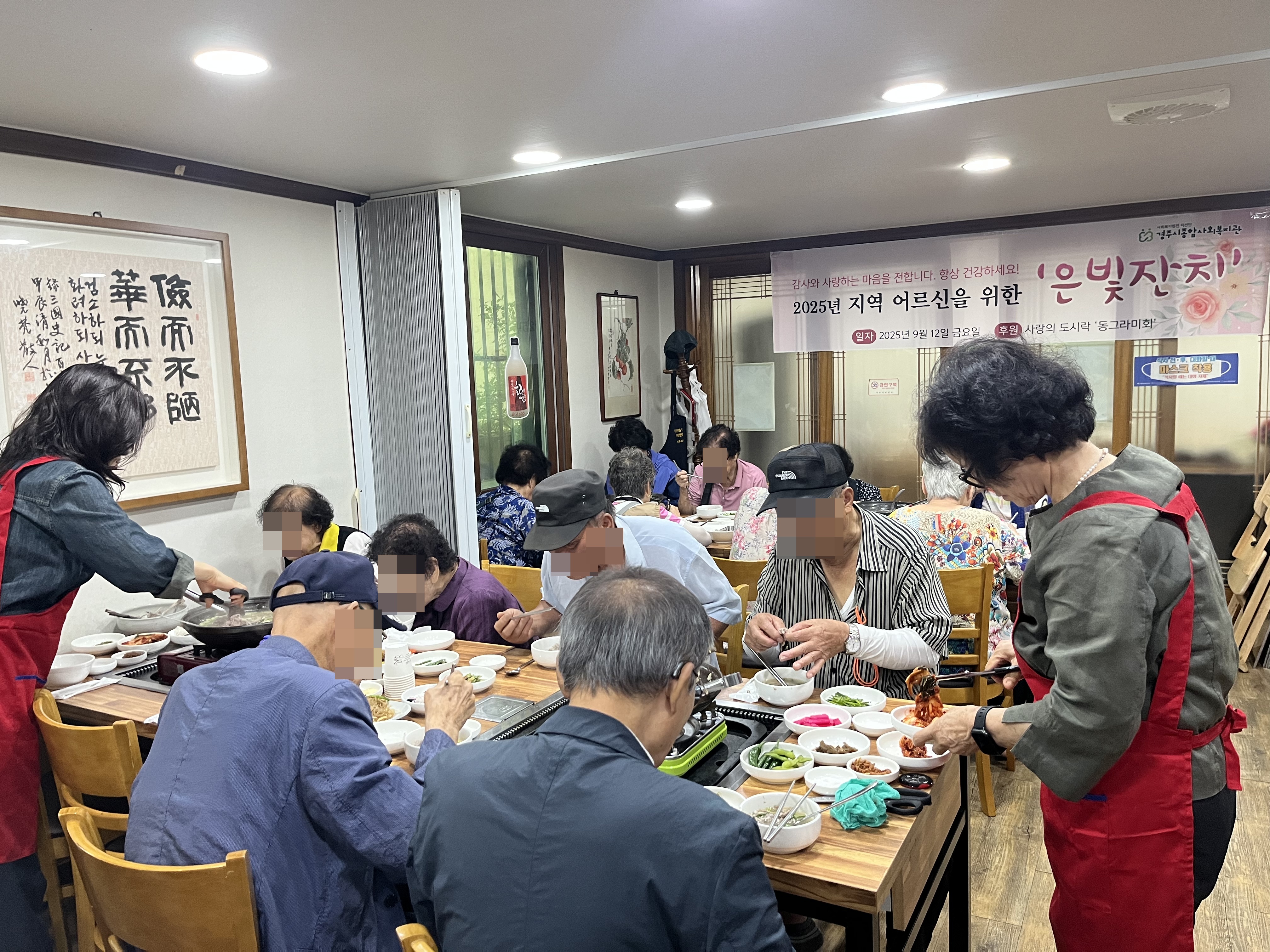 지난 12일 동천동 소재 식당 고미정에서 2025년 지역 어르신을 위한 ‘은빛잔치’를 진행했습니다. 지역사회 복지사업에 관심이 있는 자원봉사 단체인 ‘동그라미회’의 후원을 통해 무연고·독거 어르신을 대상으로 정서적 외로움과 소외감을 해소하기 위한 행사를 진행하고 있습니다. 이번 행사는 참여자 가운데 최고령 남·여 어르신을 중심으로 한 생신 파티를 시작으로 영양 가득 오리백숙 식사, 단체 레크리에이션 등 다채롭게 구성되어 삶의 활력을 느낄 수 있는 시간이었습니다.