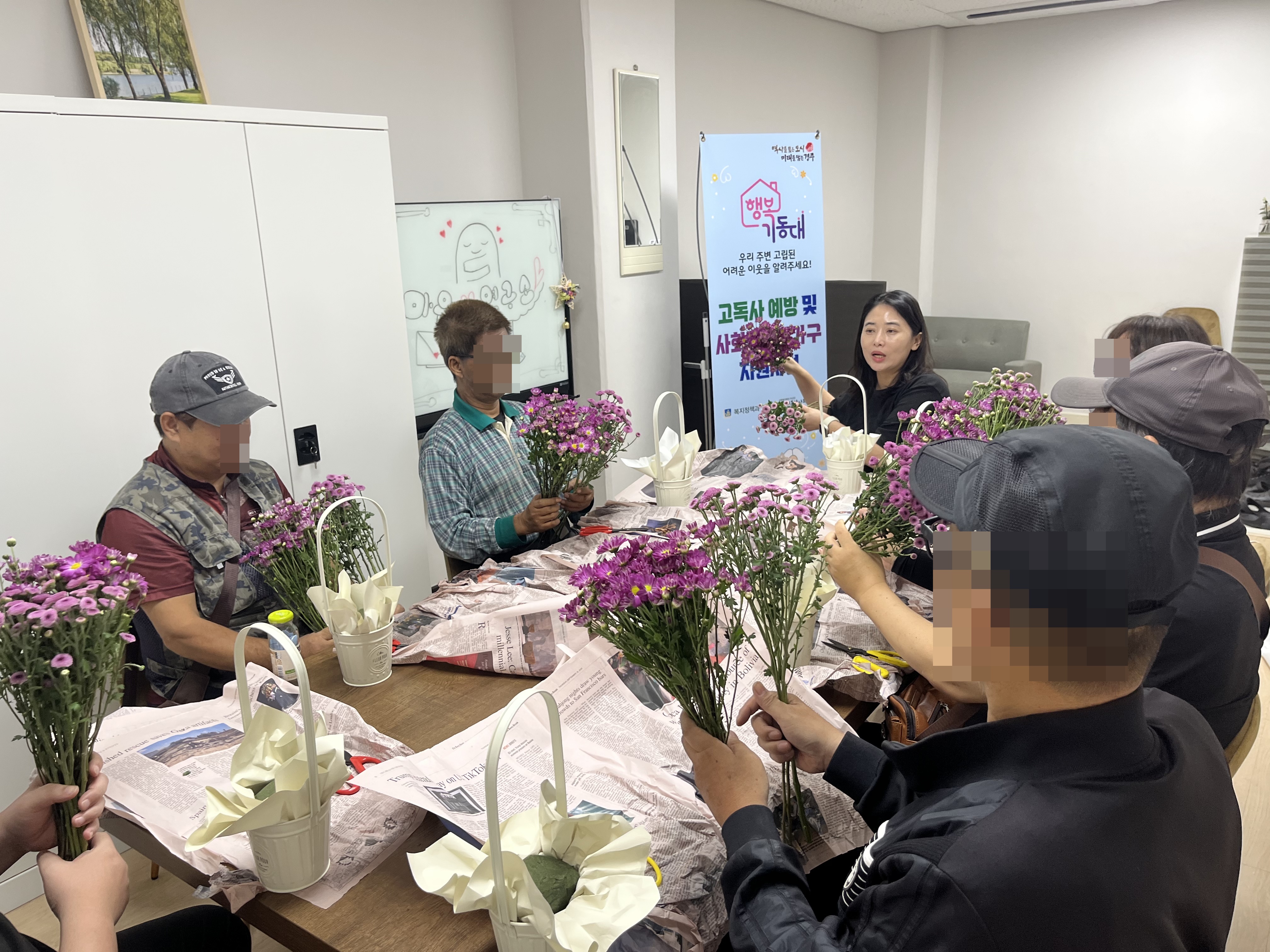 마음연구소 세부 프로그램인 심심(心心)연구실에서는 화사한 9월을 보냈습니다. 누름 꽃을 이용하여 추억의 액자를 만들기도 하고 가을을 대표하는 꽃인 국화를 이용하여 꽃바구니를 만들어보았습니다. 활동 중 참여자께서 “예쁜 꽃을 바라보는 것만으로도 감정의 예민함이 줄어들고 정서적으로 안정을 주는 것 같다”라고 하신 말씀이 기억에 남습니다. 여러 모습의 꽃들이 조화를 이루고 군락을 지어 살 듯 우리 지역사회에도 모든 구성원이 더불어 살아가길 바라봅니다.