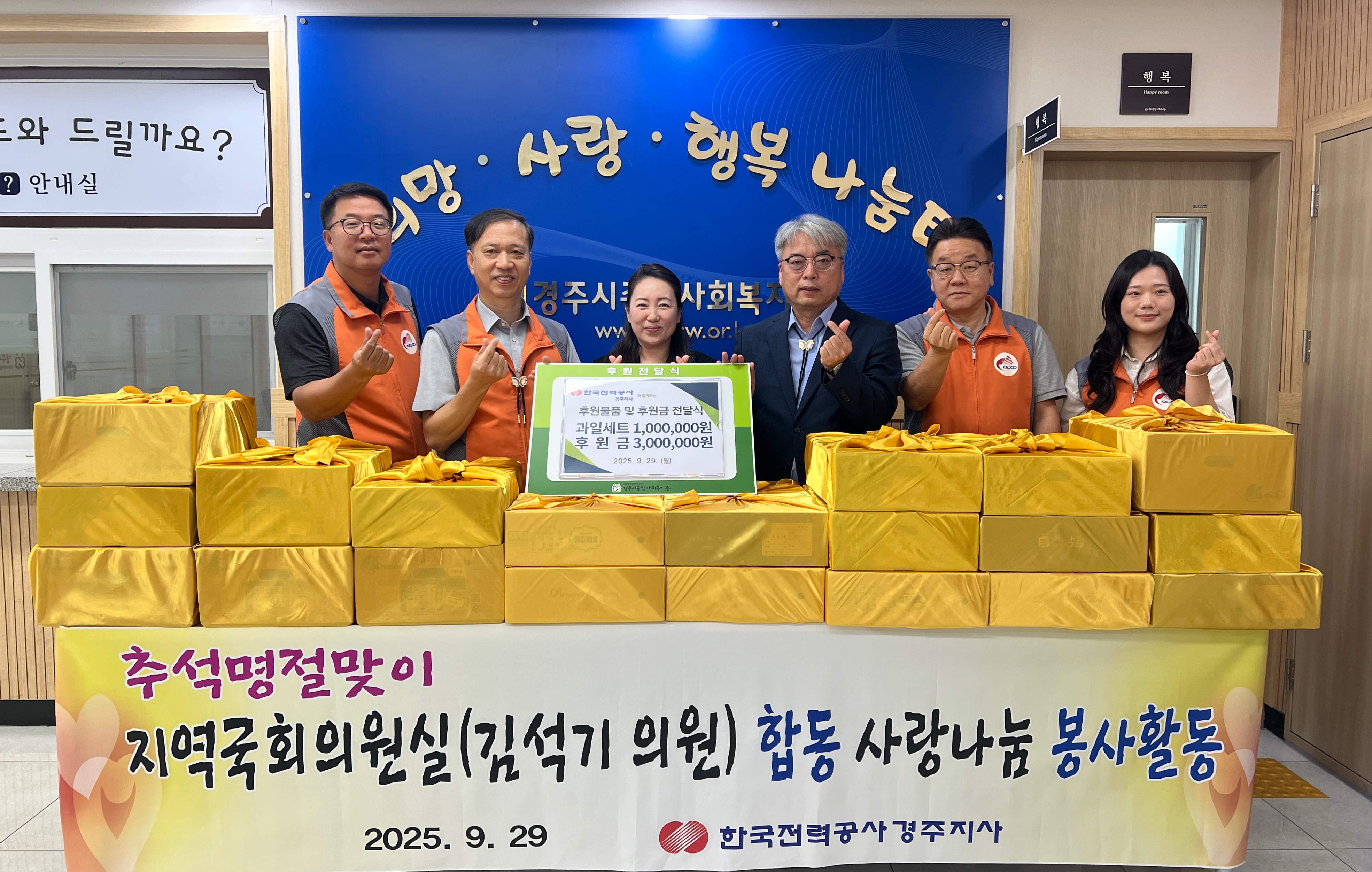 한국전력공사 경주지사에서 후원금과 과일 세트를 전달해주셨습니다. 전달해주신 후원금과 과일 세트는 지역사회에 따뜻한 나눔의 가치를 확산하는 데 소중히 사용하겠습니다.
