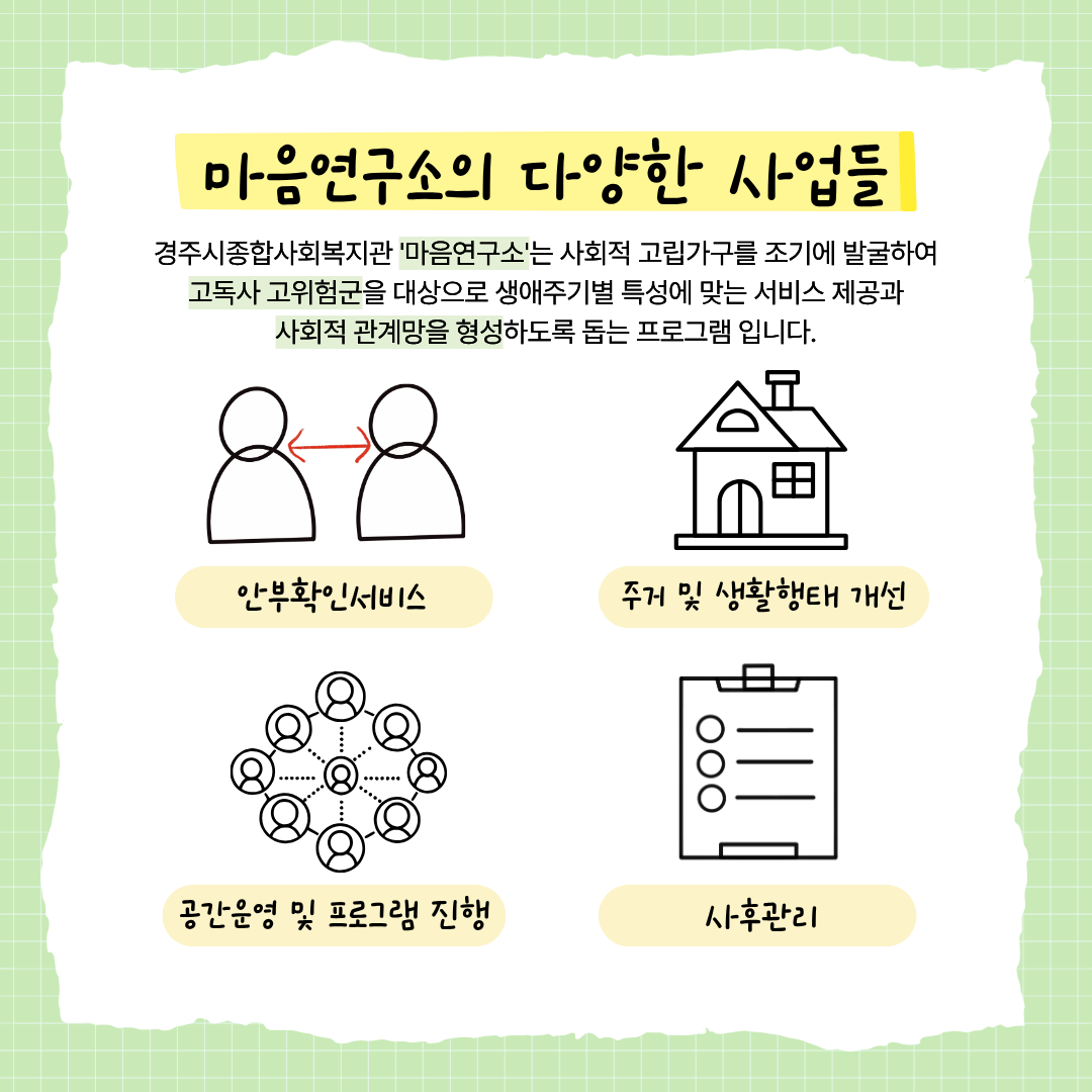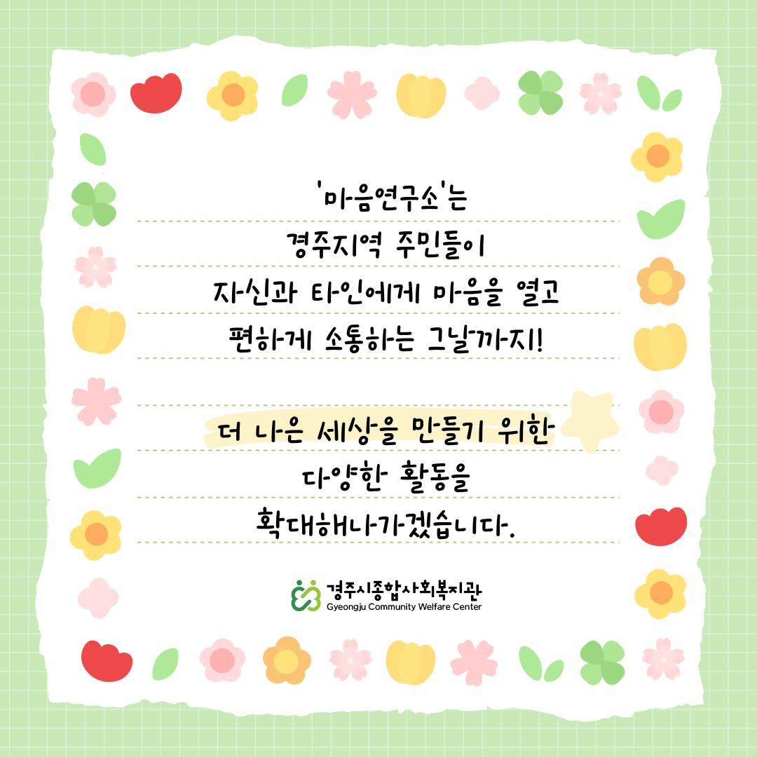 주변에 고립된 생활을 하는 주민이 계신다면 마음연구소로 연결해주세요. 경주시종합사회복지관이 함께하겠습니다!