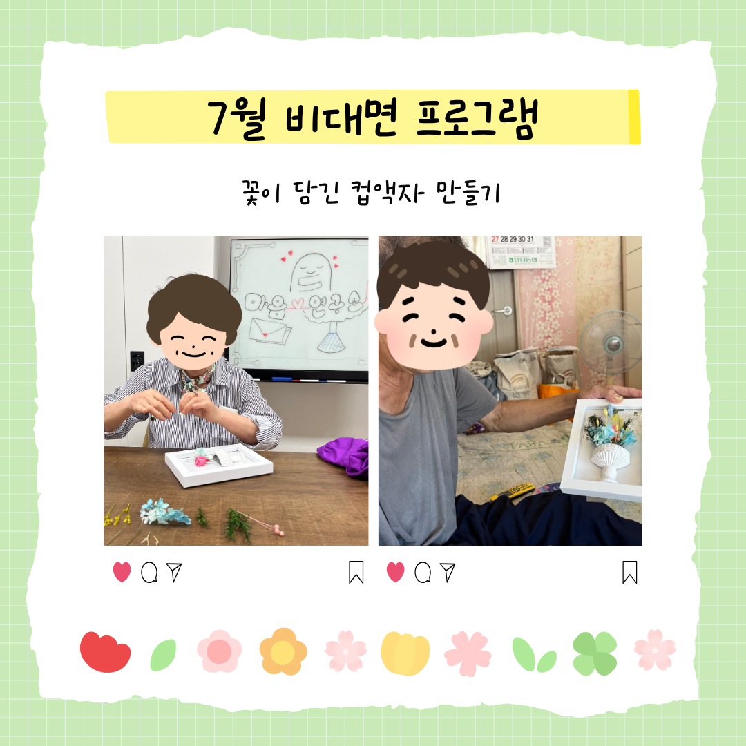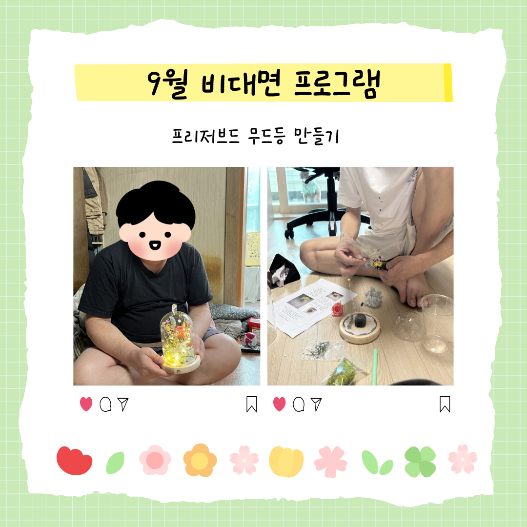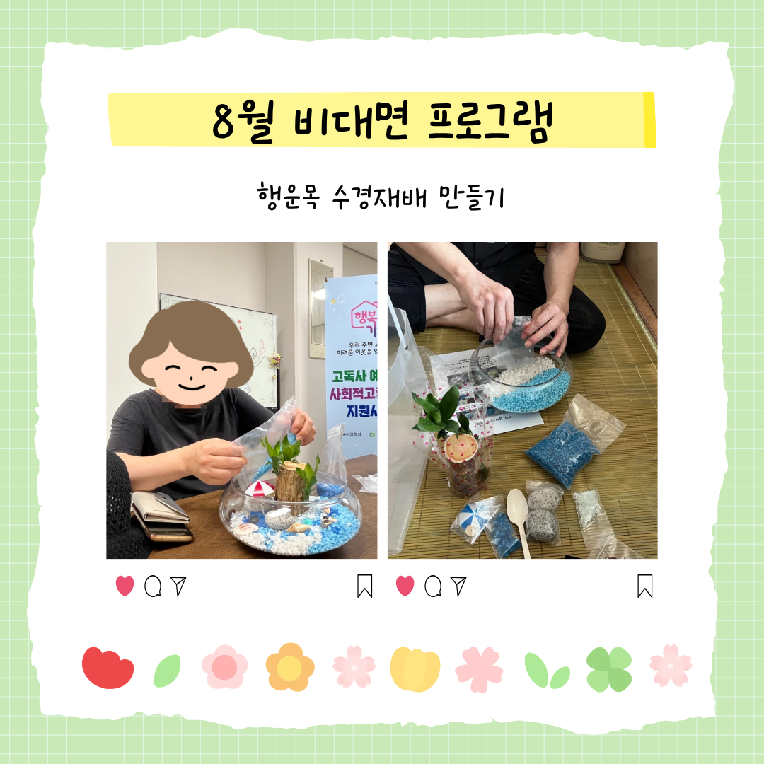 정서적 안정과 타인과의 교류를 목적으로 매월 비대면 키트를 제작하여 대상자 각 가정에 방문합니다. 아직 지역사회로의 외출과 사회적 소통에 준비가 필요한 분들을 중심으로 사회복지사가 1:1 활동을 진행하면서 마음의 벽을 낮추실 수 있도록 조력하고 있습니다.